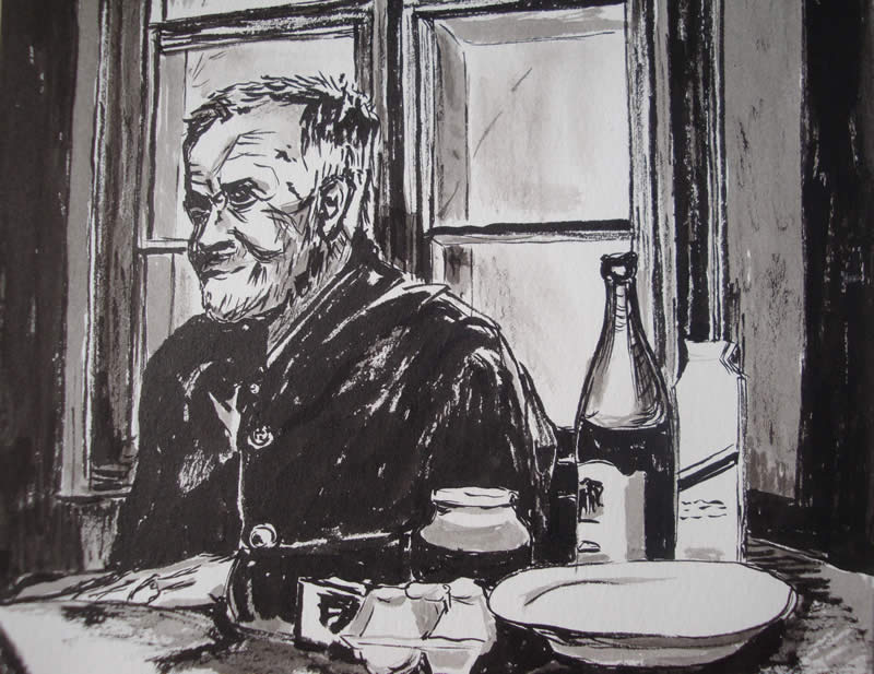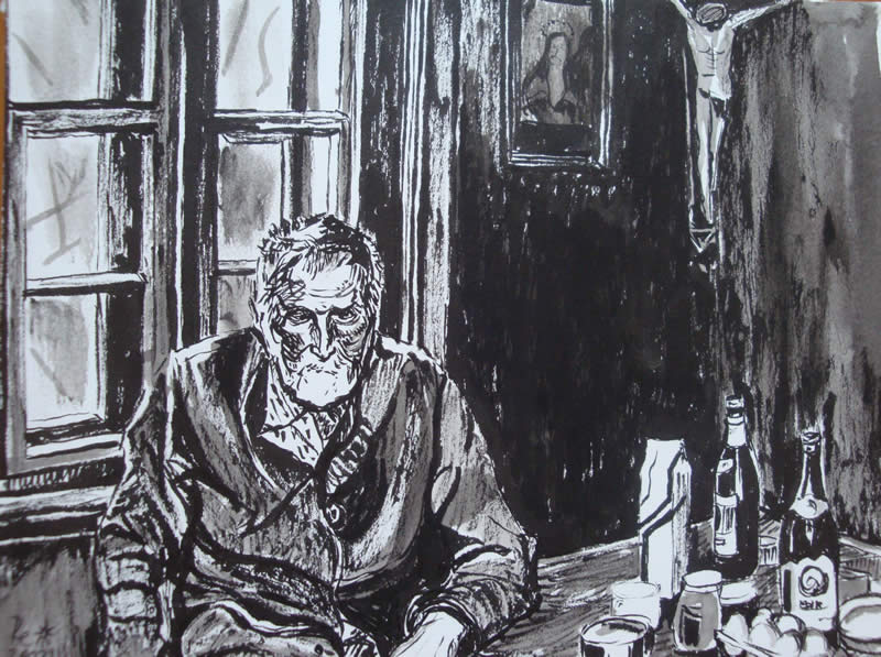 Feierabend, Tuschmalerei, 20x21 cm